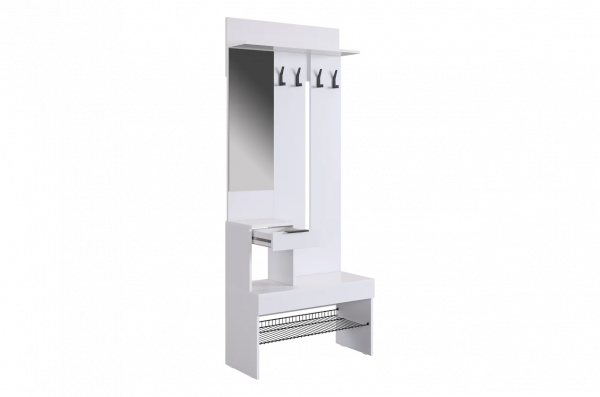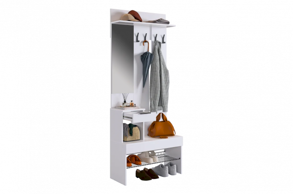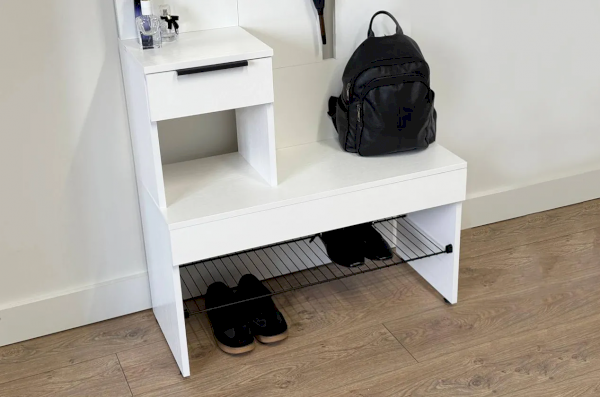 Крючки для одежды обеспечивают удобное место для размещения верхней одежды и аксессуаров, а выкатной ящик предоставляет дополнительное пространство для хранения мелочей. Сетчатая полка для обуви позволяет аккуратно разместить обувь, обеспечивая вентиляцию и легкий доступ.
